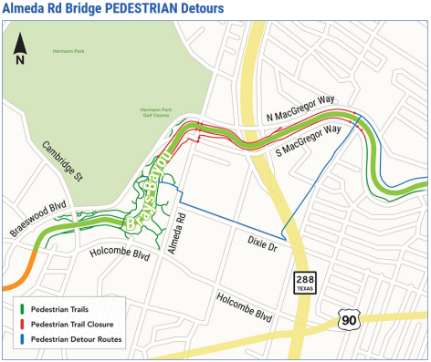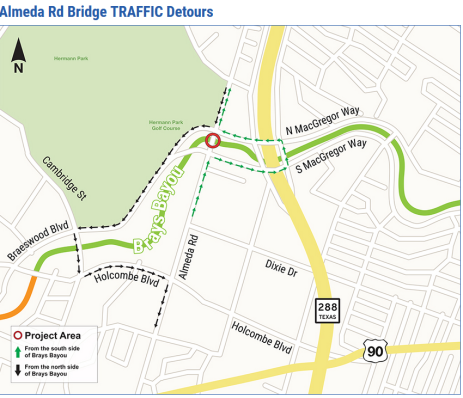 As you know, the Almeda Rd bridge crossing MacGregor Way is under construction. Here is some information from the www.projectbrays.org site.